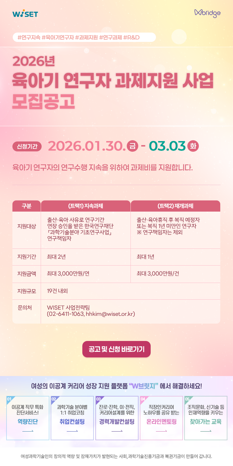 | 한국여성과학기술인육성재단) 2026년 육아기 연구자 과제지원 사업 안내 | 2026-02-03 | ||
