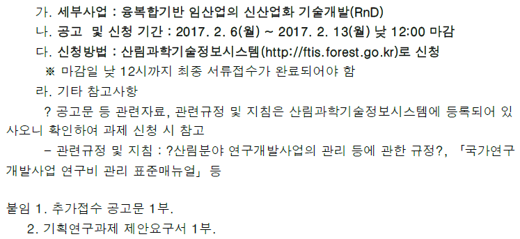 | [산림청] 2017년도 "융복합 기반 임산업의 신산업화 기술개발" 신규과제 추가 접수 안내 | 2017-02-08 | ||