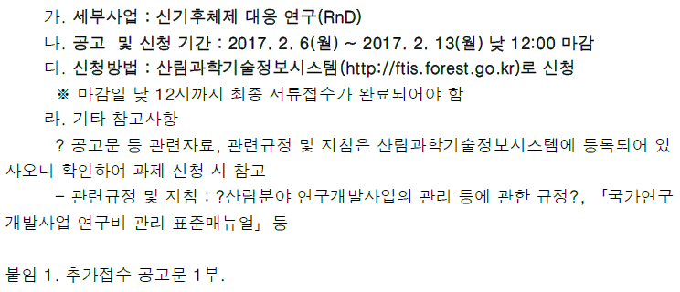 산림청에서는 2017년도 "신기후체제 대응 연구" 사업의 신규 자유공모과제 추가접수를 계획하고 있습니다.