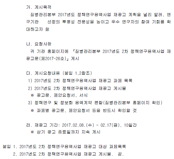 | [질병관리본부] 2017년도 2차 정책연구용역사업 재공고 게시 협조 안내 | 2017-02-14 | ||