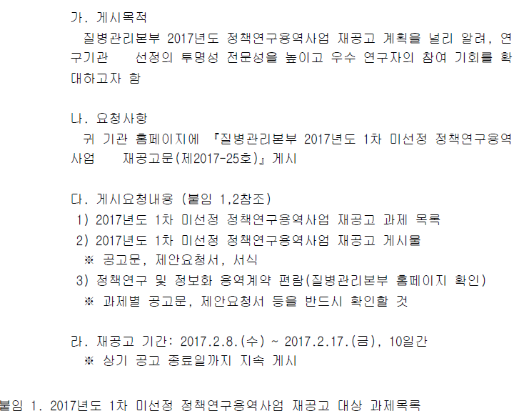 질병관리본부에서 시행하는 2017년도 1차 미선정 정책연구용역사업 재공고문을 아래와 같이 공지합니다.