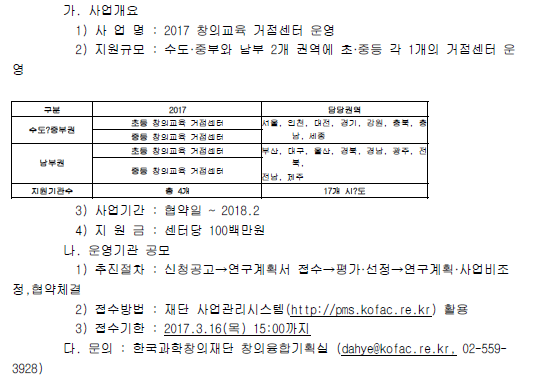 | [한국과학창의재단] 2017년 창의교육 거점센터 운영 주관기관 공모 안내 | 2017-02-20 | ||