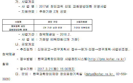| [한국과학창의재단] 2017년 창의교육 선도 교원양성대학 운영 주관기관 공모 안내 | 2017-02-21 | ||