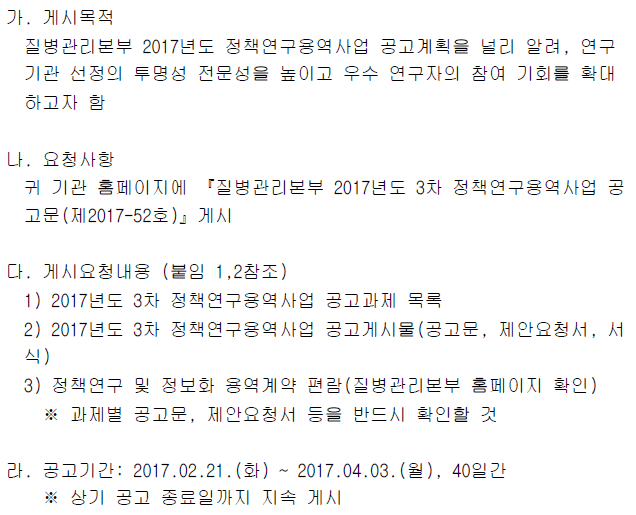 | [질병관리본부] 2017년도 질병관리본부 3차 정책연구용역사업 공고 안내 | 2017-02-23 | ||
