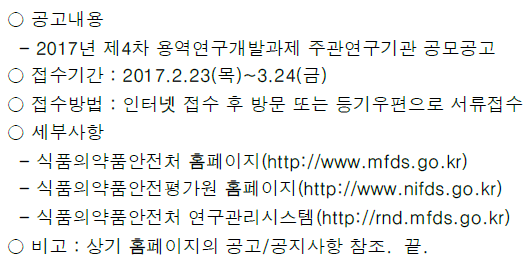 식품의약품안전처에서는 2017년 제4차 용역연구개발과제를 수행할 주관연구기관을 공모 공고중에 있습니다.