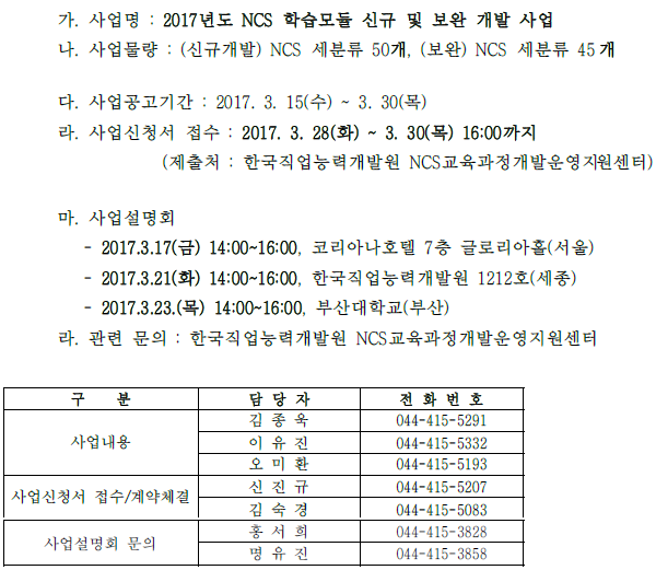 한국직업능력개발원이 위탁수행 중인 2017년도 국가직무능력표존(NCS) 학습모듈 신규 및 보완 개발 사업 참여기관 공모 내용을 다음과 같이 안내하오니, <붙임>을 참조하여 2017년 NCS 개발 · 보완 분야에서 전문성을 갖춘 역량 있는 분들의 참여를 요청 드립니다.