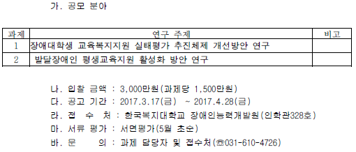 한국복지대학교 장애인능력개발원-288,289와 관련하여 한국복지대학교의 정책연구과제 2건에 대한 연구기관(자)를 아래와 같이 공모하고 있습니다.
