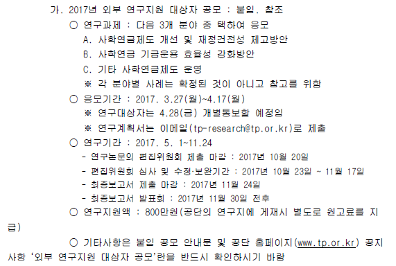 | [사립학교교직원연금공단] 2017년 외부 연구지원 대상자 공모 안내 | 2017-04-03 | ||