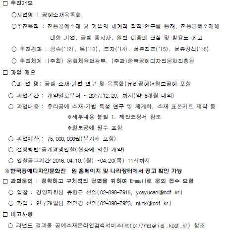 위와 관련, 2017년 선정 분야인 유리공예분야의 소재 및 기법 목록화를 위한 연구 수행기관을 아래와 같이 모집 공고하오니 많은 관심 바랍니다.