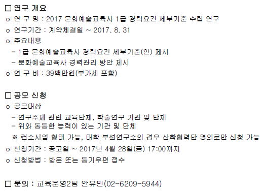 | [한국문화예술교육진흥원] '2017 문화예술교육사 1급 경력요건 세부기준 수립 연구' 수행 | 2017-04-18 | ||
