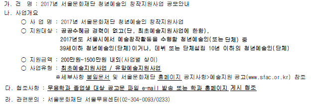 | [서울문화재단] 2017년 서울문화재단 청년예술인 창작지원사업 공모 안내 | 2017-04-20 | ||