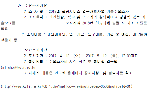 한국문화관광연구원 통계평가센터에서는 2018년 관광서비스 연구개발사업 기술수요조사를 다음과 같이 실시하오니 참여를 요청드립니다.