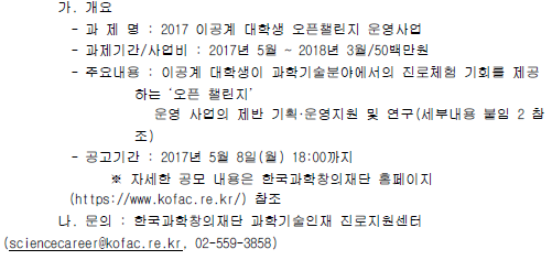 | [한국과학창의재단] 2017 이공계 대학생 오픈챌린지 운영사업단 모집 안내 | 2017-04-21 | ||