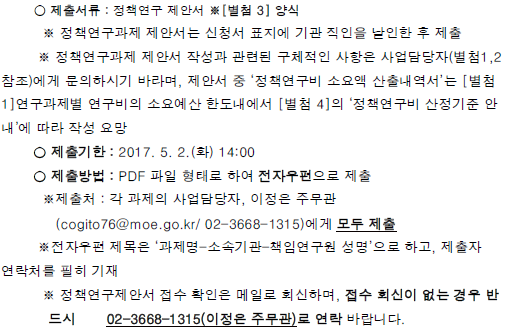 금번 2017년도 정책연구 과제를 수행할 연구자를 공모하오니 해당 연구 과제를 수행하고자 하는 연구자는 아래의 절차에 따라 기한 내에 신청하여 주시기 바랍니다.