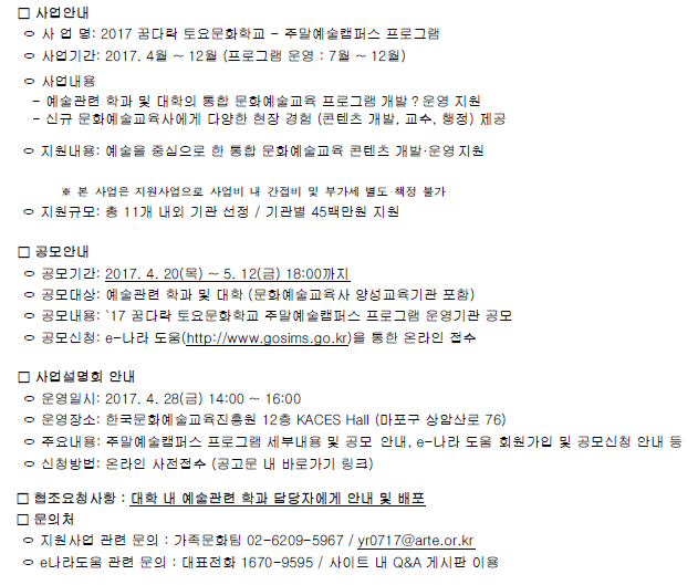 한국문화예술교육진흥원에서는 예술관련 학과 및 대학을 대상으로 「2017 꿈다락 토요문화학교 주말예술캠퍼스 프로그램 운영사업」을 아래와 같이 추진하오니, 많은 관심과 참여 바랍니다.