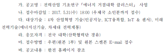 | [한국전력공사] 전력산업 기초연구 「에너지 거점대학 클러스터」 사업 공고 안내 | 2017-05-11 | ||