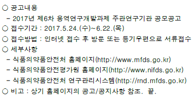 | [식품의약품안전평가원] 2017년 제6차 용역연구개발과제 주관연구기관 공모공고 안내 | 2017-05-31 | ||