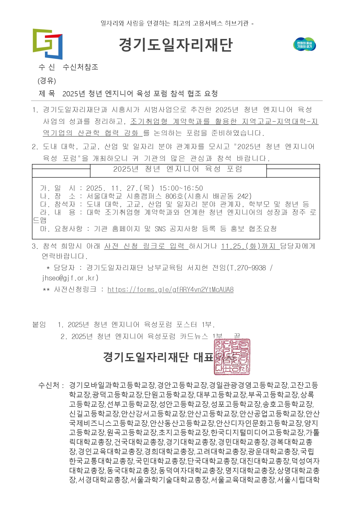 | 경기도일자리재단) 2025년 청년 엔지니어 육성 포럼 참석 협조 요청 | 2025-11-21 | ||