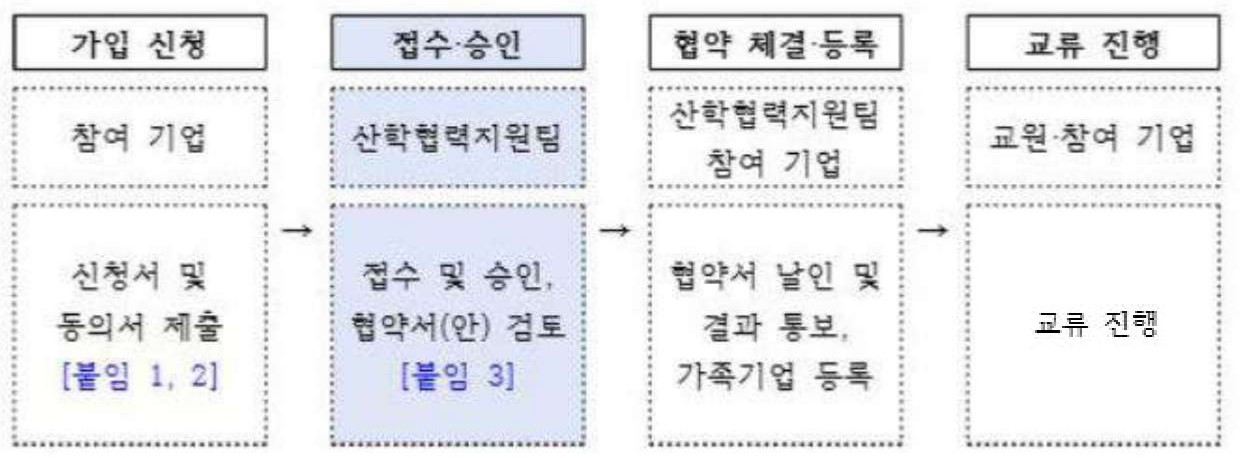 이에, 본교와 가족기업 협력을 희망하는 기업과 교원께서는 아래 절차에 따라 신청하여 주시기 바랍니다.